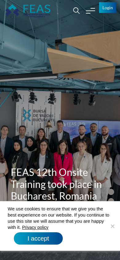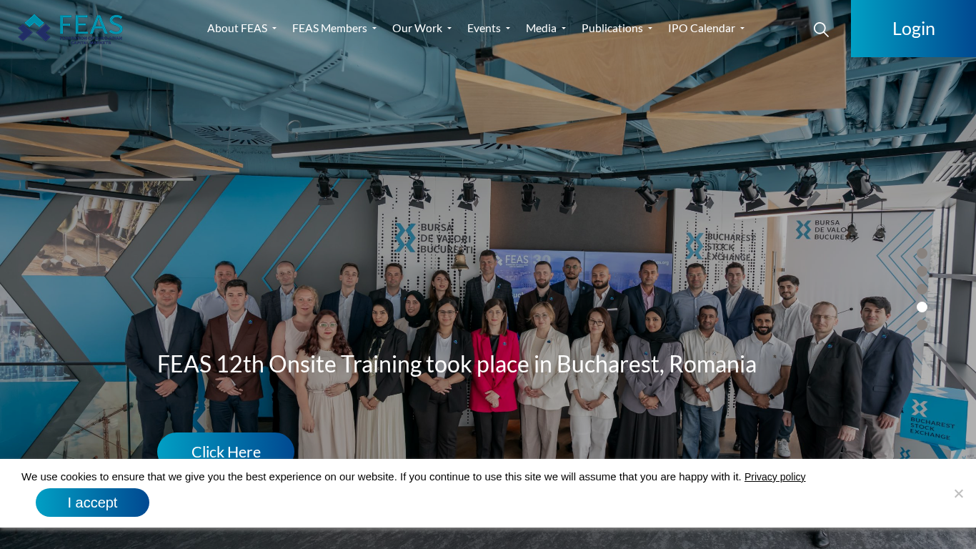 The web project "Home - FEAS" is a financial services organization with a focus on securities exchanges and market information. Keywords associated with the site include "exchange," "securities," "market," and "IPO." The title of the homepage is simply "Home - FEAS." The site has sections for news, events, membership, benefits, and training, among others. FEAS appears to be an acronym, with potential meanings including "Financial and Economic Association of Stock Exchanges" or "Finance and Exchange Association of Southeast Asia." The site includes information about various general assemblies, training sessions, and conferences, as well as fact sheets, reports, and yearbooks. Some of the news articles mention specific exchanges in Tehran and Bucharest. The site also includes a login feature for users to access their profiles and various other resources.