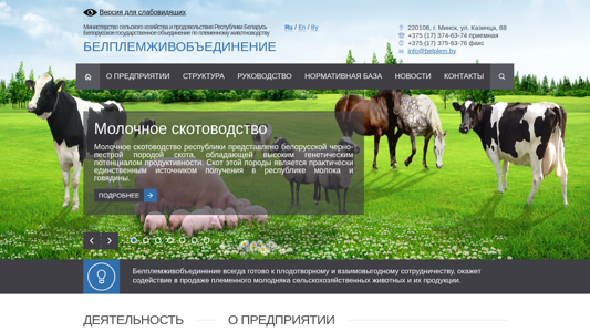 | AI-анализ | The web project "Belplemzhivoobiedinenie" is a Belarusian agricultural organization dedicated to livestock breeding. It specializes in milk and meat cattle, swine, horses, and sheep. The organization is part of the Ministry of Agriculture and Food of the Republic of Belarus and focuses on breeding and distributing high-performing livestock. The website provides detailed information on each livestock sector, including their respective populations, breeding methods, and achievements. The organization operates several plemenskye hoziaistva or specialized breeding farms for cattle, swine, horses, and sheep. Visitors can find news, contacts, and a normative base for each livestock sector on the site. |