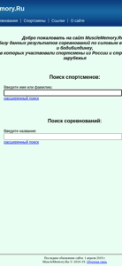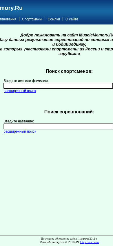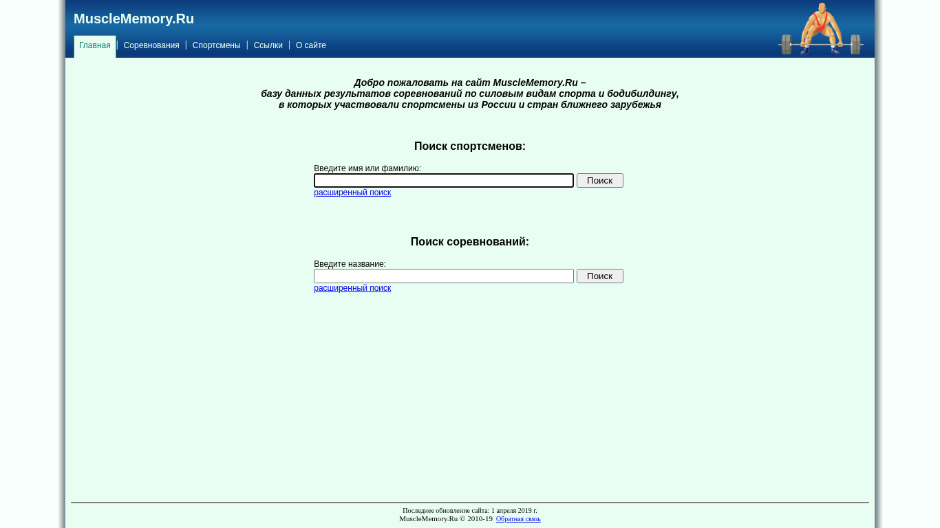 | AI-анализ | language: ru  The portal MuscleMemory.Ru is a database of results from competitions in powerlifting and bodybuilding, featuring athletes from Russia and neighboring countries. Users can search for athletes by name and for competitions by name, with the option for extended searches. The website was last updated on April 1, 2019. |