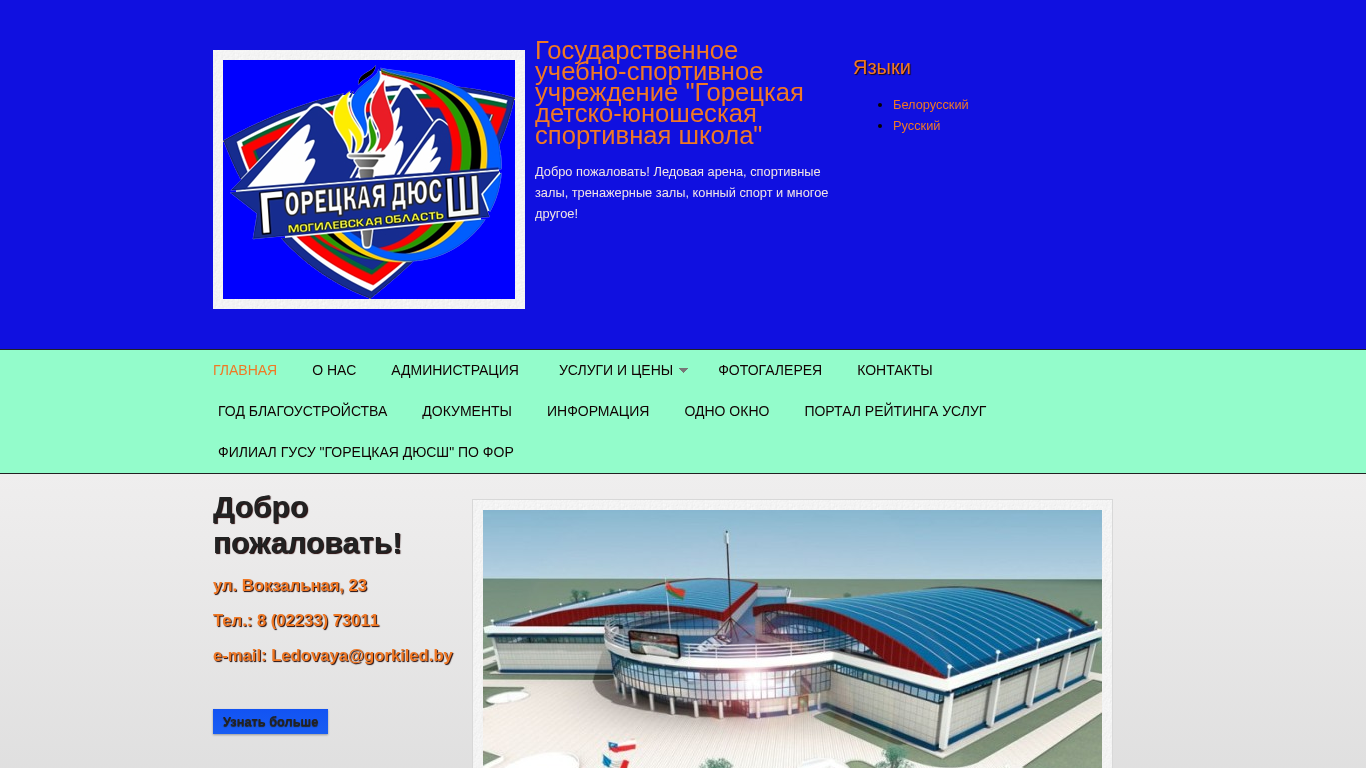 --- The web project "Goretskaya DYUSh (Goretska Youth Sports School)" welcomes visitors to various sports and recreational facilities including a ice arena, sports halls, fitness and training rooms, and equestrian sports. The school offers football, volleyball, basketball, and other sports in its sports halls. The ice arena features ice skating and hockey. The facility also has a football field, mini-football field, and tennis court. Fitness enthusiasts can use the fitness and training rooms. The contact information for the school is located on the website, including a telephone number and email address. The school also has news and announcements, including information about a mass ice skating event and the availability of free running tracks at the stadium during certain hours.