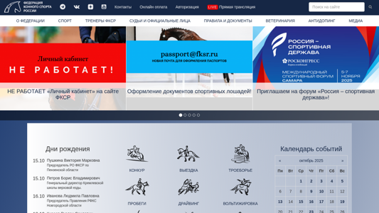 | AI-анализ | --- This online resource belongs to the Russian Equestrian Sports Federation (Федерация конного спорта России, ФКСР). The website provides information on the federation, its programs, events, and various services for sports trainers, officials, and horse owners. Keywords associated with the site include "ФКСР," "России," "приглашаем," "национальная программа," "аттестации," "тренеров," and "спортивных лошадей." The site features sections on rules and documents, veterinary services, and an anti-doping program. It also includes a calendar of upcoming events, a rating of riders in dressage competition, and contact information for various federation officials. The site includes sections on equestrian disciplines such as show jumping, eventing, driving, vaulting, and western riding. It also features a forum |