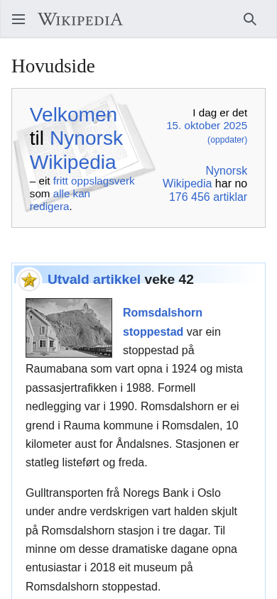 language: nn country: NO category: encyclopedia The website is the Norwegian-language version of Wikipedia, a free, multilingual, and open-source encyclopedia that anyone can edit. It contains 176,456 articles, with an example article about Romsdalshorn, a former railway station located in Romsdalen, Norway, which opened in 1924 and lost passenger traffic in 1988. The formal closure was in 1990. Romsdalshorn is a listed and protected site in Rauma commune. During World War II, gold transported from Noregs Bank in Oslo was hidden at Romsdalshorn station for three days. Enthusiasts opened a museum there in 2018. The website is currently in light mode and has a responsive design to fit the size of the