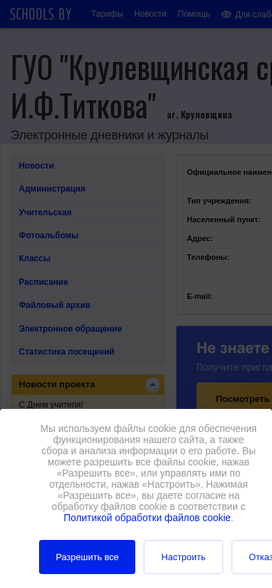 | AI-анализ | The website is for the "Krulevshchina Secondary School of Docshytsky District named after I.F. Titkov" in Belarus. It uses cookies for site functionality and data collection and analysis. Visitors can allow all cookies or manage them individually, with options to reject some. The site includes a policy on cookie usage. Functional cookies are necessary for site operation, while statistical cookies are used by third-party web analytics tools for data collection and site improvement. The domain is krulya.schools.by. |