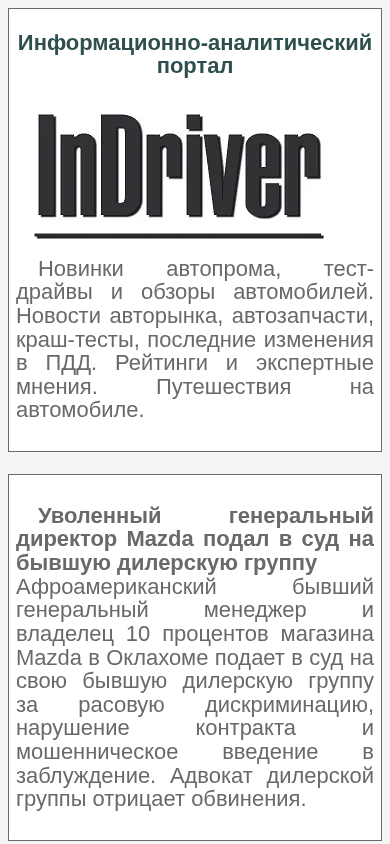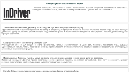 | AI-анализ | The website InDriver is an informational-analytical portal for drivers and passengers. It provides news, reviews, and expert opinions about cars, car parts, crash tests, and changes in traffic regulations. The website also covers transportation-related topics and features travel stories. Recent articles include a lawsuit filed by a former Mazda general director against a former dealership group for racial discrimination, breach of contract, and misrepresentation. Candidates for the US Transportation Secretary position include Uber and Lyft leaders. The Trump transition team plans to establish a federal structure for autonomous transportation vehicles. Proposed Trump tariffs may increase costs and disrupt supply chains. Chinese and EU officials have reached a technical consensus on tariffs for electric vehicles. Chinese and European Union officials have reached a technical consensus in ongoing negotiations to reduce or abolish tariffs on electric vehicles imported from China. Chinese auto dealers' inventory levels have decreased for the second |