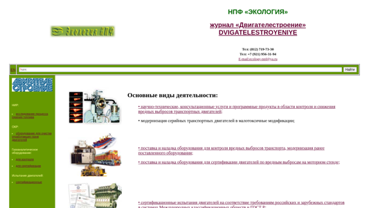 | AI-анализ | This online resource is dedicated to the Environmental Protection Fund "EKOLOGIYA" (NPF "EKOLOGIYA"). The website contains information related to engine and equipment testing, control, supply, and setup, with a focus on reducing harmful emissions from transport engines. NPF "EKOLOGIYA" offers scientific-technical, consulting services and software products in the field of controlling and reducing harmful emissions from transport engines. They also provide engine modernization to low-toxic versions and offer equipment for controlling harmful emissions from transport and the modernization of previously installed equipment. The website provides information on certification testing of engines for harmful emissions on a motor test stand and offers certification services for engines according to Russian and foreign standards. Additionally, the website offers design, supply, and setup of equipment for gas purification in engines and energy installations. The website was last updated on October 15, |