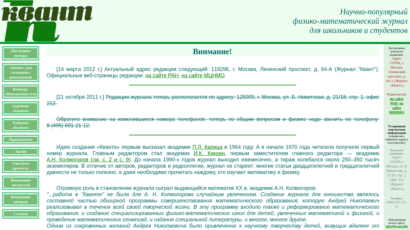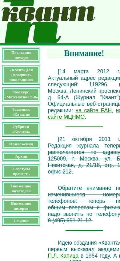 | Адрес | г. Москва, Ленинский проспект, д. 64-А (Журнал "Квант"). Официальные веб-страницы редакции: |