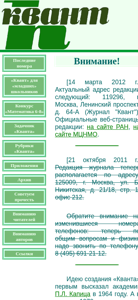 | AI-анализ | language: ru country: BY  The website 'КВАНТ' is a Russian-language, Belarusian .BY domain, hosting a scientifically-oriented, popular journal for schoolchildren and students, focusing on mathematics and physics. It features the latest issues, with recent topics including math and physics problem competitions, winners' lists, and a math and physics magazine. The website also includes archives, rubrics, applications, and a subscription service. The address of the journal's editorial office has recently changed to: 125009, Moscow, ul. B. Nikitskaya, d. 21/18, str. 1, office 212, with the phone number for general inquiries and physics-related matters being 8 (495) 691-21-12. The idea for the journal was first |