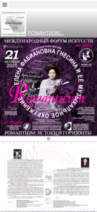 | AI-анализ | The portal Romantizm: Istoki i Gorizonti (Romanticism: Sources and Horizons) is a Russian-language international arts forum that began its operations in Moscow in 2010. The forum hosts concerts, competitions, masterclasses, seminars, and conferences, featuring musicians, composers, scholars, and educators. The focus on romanticism is intentional, as it is a significant aspect of artistic expression and development. Keywords associated with the portal include forum, art, music, competition, romanticism, sources, horizons, concert, festival, musician, performer, virtuoso, creativity, harmony, and beauty. The portal offers information about various international competitions, their regulations, jury members, and schedules. It also provides details on masterclasses, seminars, and schools led by renowned artists and educators, as well as lectures |