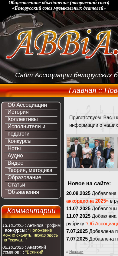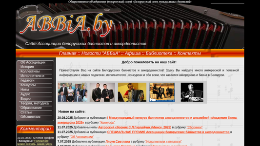 | AI-анализ | --- The web project ABBIA.by is a site for Belarusian accordionists and bayanists. It is the website of the Belarusian Union of Musician Professionals Association of Belarusian Bayanists and Accordionists. The site includes sections for news, calendar, library, contacts, history of the organization, performers and teachers, competitions, music scores, audio, video, theory, and methodology, education, articles, and announcements. The site also features biographies of performers, news on competitions, and a library of scores and recordings. Users can find information about the history of the organization, its collectives, and its performers and teachers. The site also includes announcements for concerts and competitions, as well as a section for classified ads for buying and selling accordions. Recent additions to the site include a publication on the First |