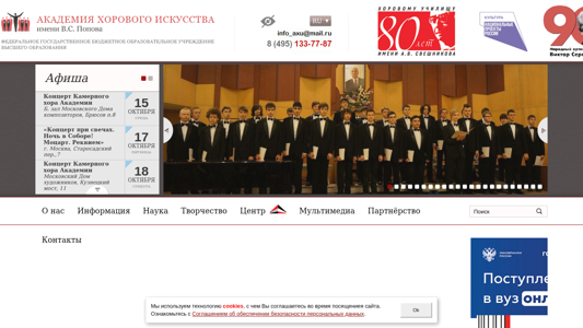 | AI-анализ | This website is dedicated to the Academy of Choral Art (AХИ) in Moscow, Russia. The title of the website is "АХИ.РУ" in Cyrillic script. The description section contains no specific text, but keywords and top words provide information about the organization. The keywords include "октября" (October), "года" (years), "академии" (academy), "искусства" (art), "музыки" (music), and "концерт" (concert). Top words indicate the names of specific events, such as "Концерт при свечах. Ночь в Соборе!" (Concert by Candlelight. Night at the Cathedral!), "Новые прочтения. Открытия и премьеры" (New Readings. Openings and Premieres |
