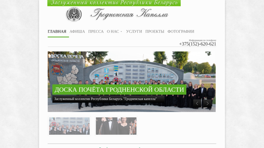 | AI-анализ | This online resource is the official website for the "Grodno Capella" - a cultural institution based in Grodno, Belarus. The website contains information on the group's schedule, press, background, services, projects, photo gallery, and contact details. Keywords associated with the site include "Belarus", "address", "Grodno", "capella", and various phone numbers and email addresses. The site uses Joomla 2.5 template and is located at Tizengaus square, apt. 7 in Grodno, Belarus. Visitors can purchase tickets and inquiries by calling +375 (152) 62-06-21 or +375 (33) 358-82-88. The site is protected against spam bots and requires JavaScript to be enabled for viewing. The " |