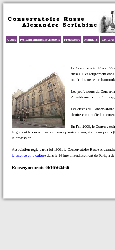 | SEO-описание | Conservatoire Russe de Paris : Cours de piano, cours de chant, cours de guitare, cours de violon, cours de balalaika, cours de solfège, peinture d'icônes |