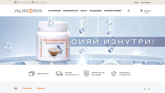 | AI-анализ | The web project "Компания АВРОРА" is the official website of Company AVORA, featuring an online shop for customers to place orders and purchase products. Keywords associated with the site include "интернет-магазин", "заказать", "купить", "аврора", "aurora", "компания", "официальный", "сайт". The homepage showcases information about the company, its mission and values, and its promise to society. The site also includes sections on offices for sales, customer and representative opportunities, a rewards program, and a science section discussing intercellular matrix theory and anti-aging solutions. The main product categories include herbal infusions, tonics, peptides, and skin care items, with various sets and promotional offers available. The site is available at the .com domain, aur- |