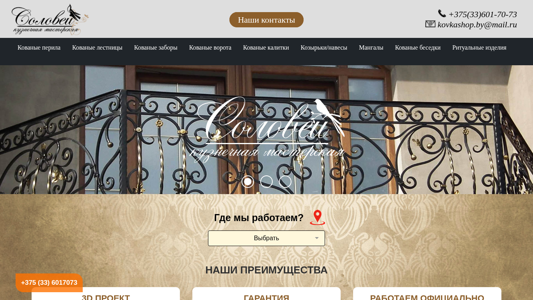 | AI-анализ | --- The web project "Столбцы.С-Ковка.BY" specializes in the production and sale of wrought iron items including staircases, fences, railings, gates, mangals, arbors, and ritual objects in the city of Stolbtsy, Belarus. The project offers a 3D design service for customers to review and approve designs before production begins. The business guarantees high-quality workmanship and materials, and caters to both individual and organizational clients, offering both cash and bank transfers as payment methods. The website provides contact information for inquiries. |