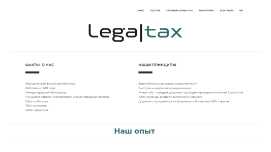 The web project Legaltax I Юристы для бизнеса. Эксперты в налогах (Legaltax - Lawyers for Business. Experts in Taxes) is a legal firm based in Belarus. The firm prides itself as the 'best in the city' for expertise in energy and international taxes. The company was founded in 2011 and maintains an international background. The office is located in Minsk and serves over 700 clients with more than 1400 projects. The firm adheres to European standards in service delivery and ensures quick and reliable communication. All team members are fluent in English. The firm cooperates with legal firms in over 100 countries. Their services include consulting for banking and FinTech incubators, as well as legal expertise for target companies. Roman Shpakovsky, a partner at the firm