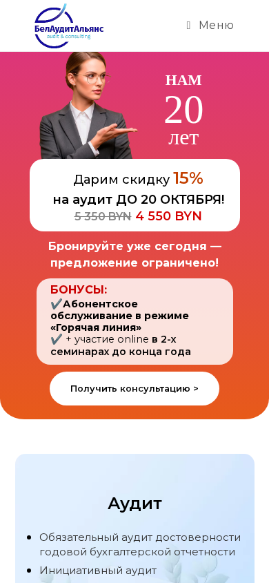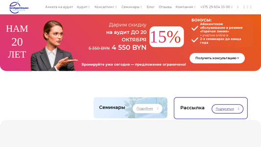 SEO-описание➤ Аудиторские услуги в Минске и Беларуси, консультационный центр, разработка положений, регламентов, стандартов для компании, актуальные семинары и вебинары. ✅ 20 лет на рынке аудиторских услуг. ☎ +37529 604 33 00