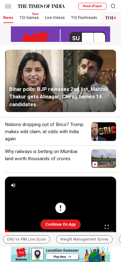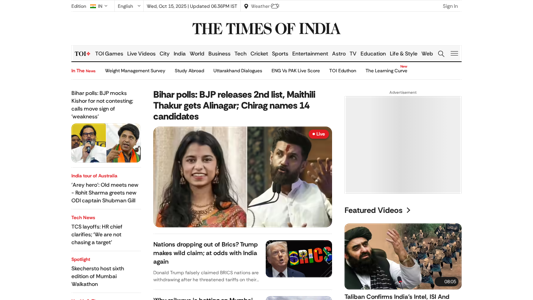 | AI-анализ | The portal The Times of India is a news website that provides breaking news and latest news on various topics including India news, world news, sports, business, entertainment, and politics. Users can access news articles in multiple languages such as English, Hindi, Marathi, Kannada, Tamil, Bengali, Malayalam, Telugu, Gujarati, and Urdu. The website features sections for different cities, weather updates, and live videos. Topics covered include Bihar Election 2025, Maharashtra, Karnataka, Telangana, West Bengal, and other states. Additionally, there are sections dedicated to digital news, arrest operations, Sindoor Cancel Patriarchy, and web stories on various themes such as business, tech, cricket, sports, entertainment, astrology, education, life & style, and more. The website also offers a |