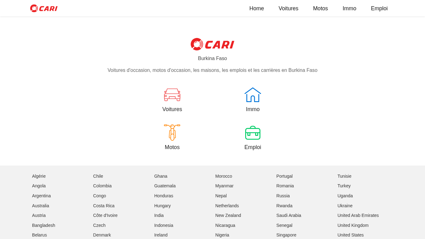 | SEO-описание | Rechercher des voitures d'occasion, motos d'occasion, des maisons, des emplois et des carrières à Burkina Faso |