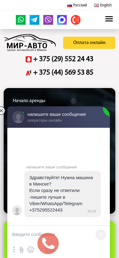 | AI-анализ | --- The portal Mir-Avto offers car rental and leasing services in Minsk, Belarus. Prices start from 55 BYN per day, with over 100 vehicles available for rental, including economy, middle, business class, SUVs, minivans, and wedding cars. Short-term and long-term rentals are accessible, with a free 300 km mileage and a child seat included. Online booking is available. The website provides information on car models, conditions, and pricing, as well as FAQs, partnerships, and contacts. Various payment options, delivery services, and discounts are offered. Car brands include Audi, BMW, Chevrolet, Citroën, Dodge, Ford, Hyundai, Infiniti, Kia, Lexus, Mazda, Mercedes-Benz, Mitsubishi, Op |