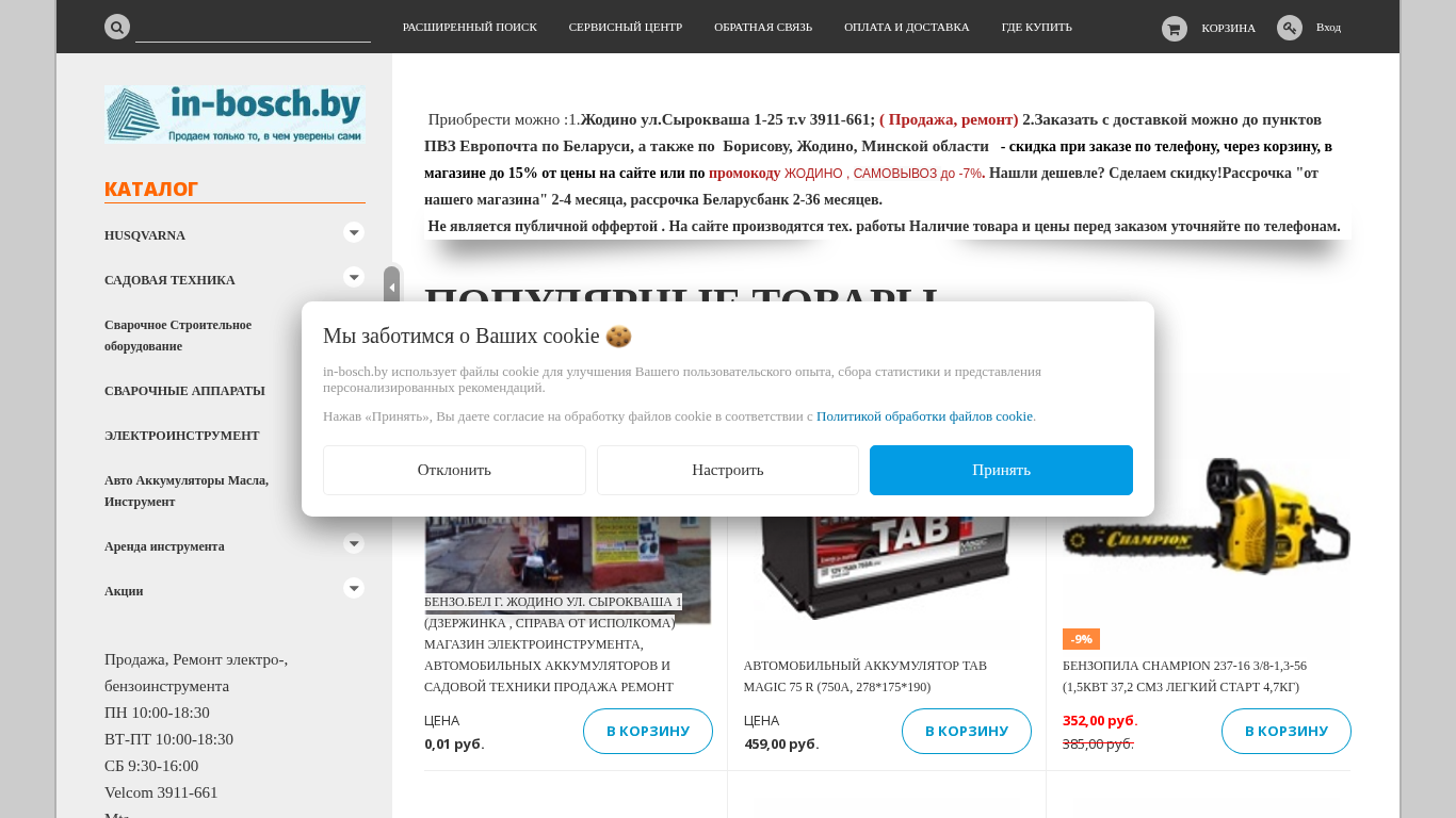 | SEO-описание | Газонокосилки, триммеры, бензопилы, электроинструмент, сантехника, автомобильные аккумуляторы, культиваторы, мотоблоки, садовая техника, масла в одном месте. Лучшие цены в городе. Бесплатная доставка по Беларуси магазин Жодино ул.Сырокваша. |