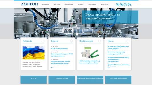 | AI-анализ | The website "ЛОГIКОН" (Logicon) is a Ukrainian company catalog focused on industrial automation and manufacturing industries. Established in 1994, the company offers solutions for various sectors including heavy industry, machinery manufacturing, information technology, fuel and energy complex, processing and light industries, and chemical and food industries. The website features news, product information, and contact details. Notable products mentioned include a Rock-301 connector from Advantech, a two-story WAGO connector with a lever, and a new sensor from Advantech. The website also provides information on how to clean an electromagnetic DANFOSS valve and industrial keyboards or trackballs, as well as extended WAGO clamp line offerings for building electrical installation, and news on Metro Almaty being managed by GENESIS64. The site offers registration and login |