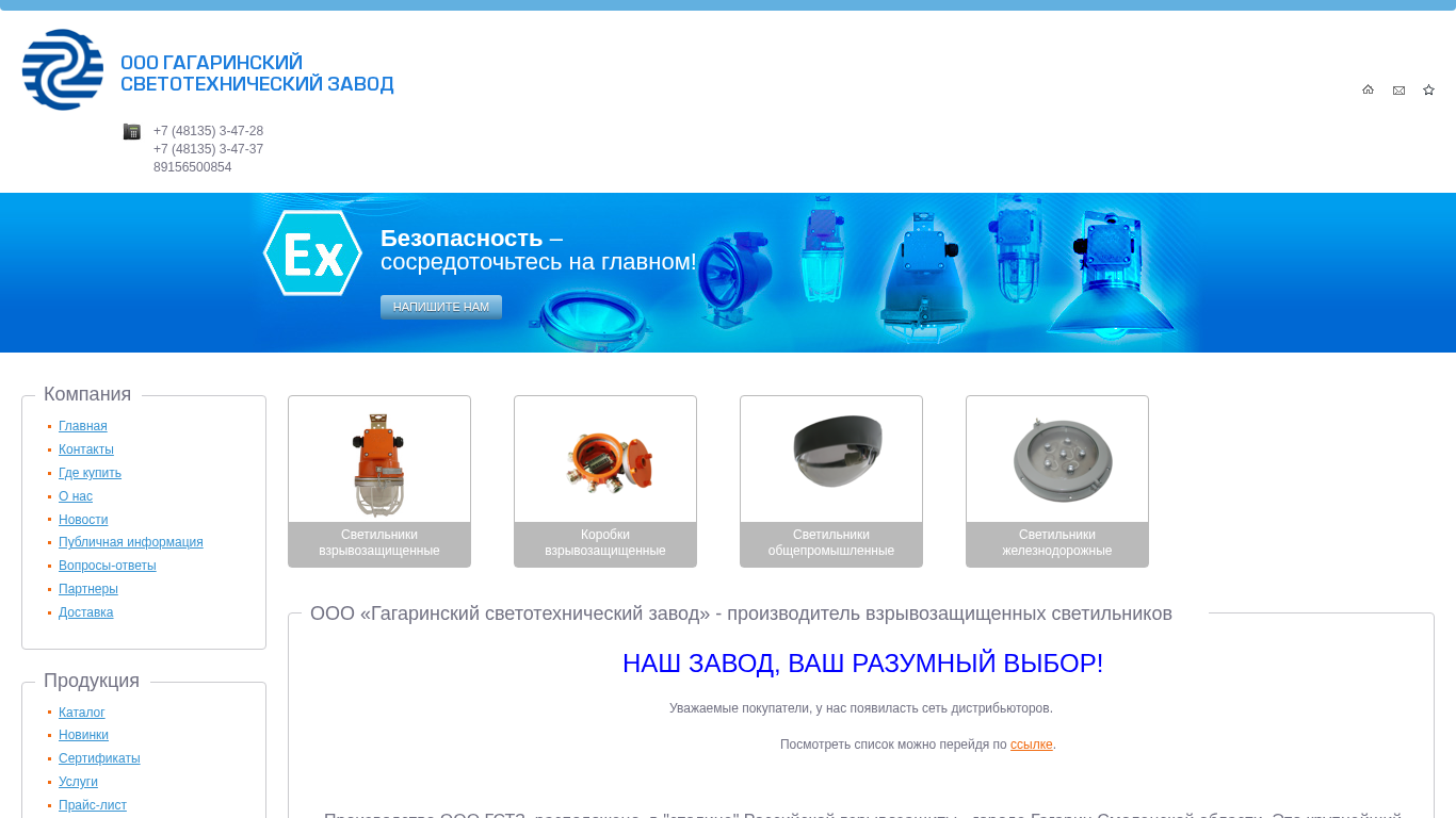 Название / ЗаголовокПроизводитель взрывозащищенных светильников - ООО «Гагаринский светотехнический завод». Мощные светодиодные светильники