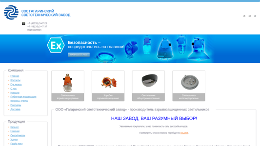 --- The web project "Industriya-gstz.ru" is a Russian-language website for OOO "Gagarinsky Svetotehnicheskii Zavod," or the Gagarin Lighting Technology Factory, which specializes in producing vzryvozaschitennye (vzryvozaщищенные in Cyrillic) or explosion-proof lighting fixtures. The site provides information on the company's products, contacts, and news. The main product categories include vzryvozaщищенные светильники (explosion-proof lighting fixtures), korbki vzryvozaщищенные (explosion-proof enclosures), and other industrial and railway lighting products. The company, which has existed since 1932, is the largest producer of explosion-proof electrical equipment in Russia and is located in the city