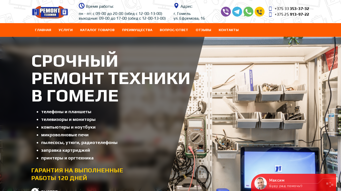 | SEO-описание | Ремонт техники в Гомеле услуги по ремонту мобильных устройств, компьютеров, телевизоров, пылесосов, микроволновых печей и многое другое. Сельмаш, Ефремова звоните +375 33 353-37-32 работаем до 20.00 |