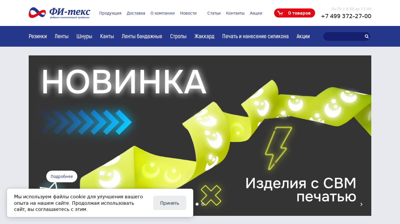 | SEO-описание | Фабрика лентоткацкой продукции Фи-текс — производство, продажа лент, резинок, строп, шруров оптом. Компания предлагает лентоткацкую продукцию высокого качества оптовикам Москвы и Санкт-Петербурга. |