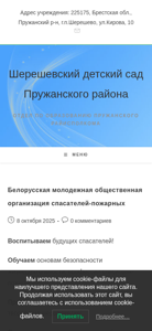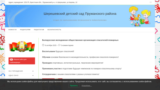 | AI-анализ | The website <shereshevo-sad.pruzhany.by> is operated by the Education Department of the Pruzhansky District Executive Committee in Belarus. It primarily focuses on a kindergarten named Шерешевский детский сад (Shereeshsky Detsky Sad, or Shereesh Kindergarten) located in the village of Shereeshvo. The website provides news, educational resources, and information on safety matters for parents and pedagogues. It also features articles on various topics related to childcare and development, including speech problems and solutions. The website also mentions a youth organization called Белорусская молодежная общественная организация спасателей-пожарных (Belarusian Youth Public Organization of Firefighters and Rescuers), which seems to have some affiliation with the kindergarten. The website was |