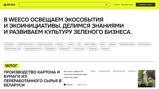 --- The web project weeco.by is dedicated to covering ecological events and initiatives, sharing knowledge, and promoting the culture of green business. The site includes sections on various environmental topics such as cycling, air pollution, green economics, zero waste, climate, forest, science, clothing, waste sorting, ecological footprint, ecopreneurs, and ecofriendly habits. Some popular keywords associated with the site include 'weeco', 'min' (likely a reference to Minsk, the capital city of Belarus), 'одежда' (clothing in Russian), 'сортировка' (sorting), 'мусора' (trash in Russian), 'экологический' (ecological), 'след' (trace or footprint), 'экопредприниматели' (ecopreneurs), and 'экопривычки' (ec