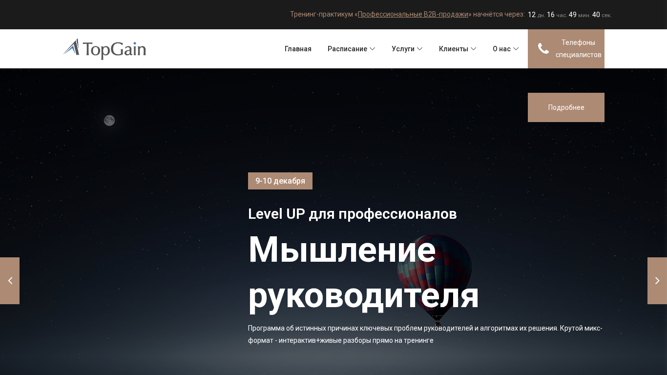 | Название / Заголовок | ТопГейн | Развитие продаж, обучение руководителей и специалистов | Главная |
