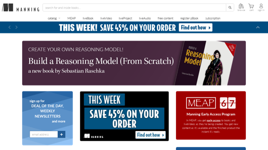 The website manning.com is an online bookstore specializing in selling software development and engineering books. The title of the website is "Manning" and it offers a wide range of topics in software development, including application development, code quality and testing, concurrency and parallel computing, distributed systems, database development, game development, security and privacy, software architecture and design, technology and computing, version control, software engineering management, web API, AWS frontend and backend frameworks, web design, mobile app development, cross-platform development, data visualization, web security, languages, microservices, web performance, static web sites, web servers, Node.js, MEAN stack, Meteor, enterprise development, application development frameworks, enterprise architecture, technical leadership, databases, database platforms, data processing and analytics, data persistence, security and infrastructure, cloud, cloud providers, containerization, data engineering, messaging systems