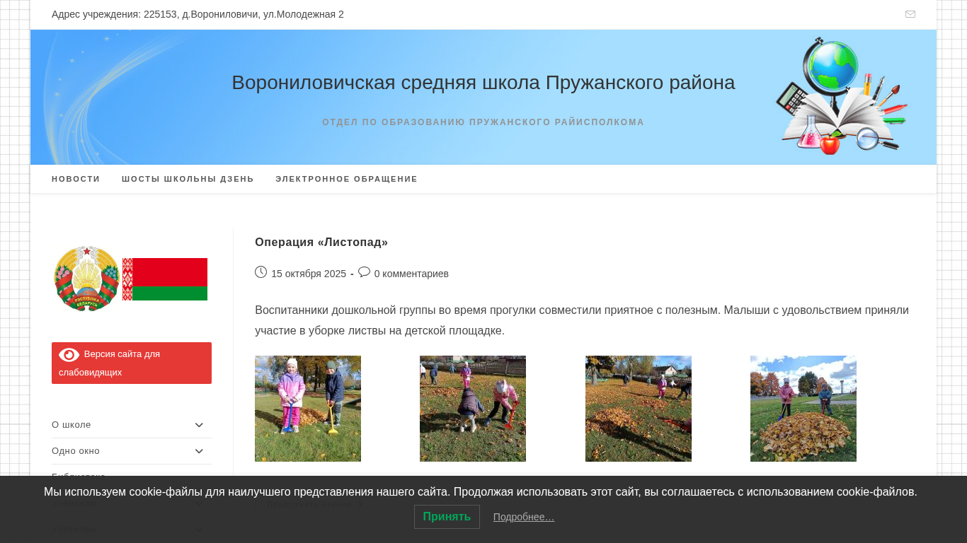 | AI-анализ | The web project "Voronilovichi Secondary School of Pruzhansky District — Education Department of Pruzhansky Regional Executive Committee" is an educational institution in Belarus. The title of the website includes the name of the school and the education department of the region. The description section includes several news articles, with topics such as "Operation 'Listoпад'", "Mother's Day program", and "Class hours 'My psychological well-being'". The articles were published in October 2025 and have no associated comments. The website also mentions an event called "My Healthy Lifestyle Generation" and invites students to attend a sports day on a Saturday. The school's address is listed as 225153, d. Voronilovichi, ul. Mолодежная 2. |