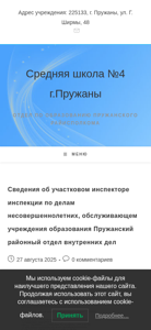 | AI-анализ | This online resource is dedicated to Middle School No. 4 in Pruzhany, Belarus, and its educational department of the Pruzhansky district executive committee. The website provides news, schedules, information on leadership, safety, and other relevant topics for the school community. The latest news includes updates on energy safety, a mother's hobby, and a contest called "An Image Created by the Heart." The schedule section offers information on the school's routine, and the leadership section includes details on the educational institution's administration. The safety section covers topics related to home and street safety, as monitored by the local inspectorate of the interior affairs department. The website was last updated on October 15, 2025, with no recorded comments. |