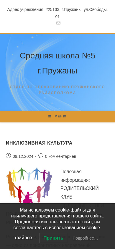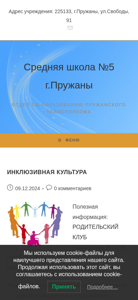 | AI-анализ | The website is a school website for Middle School #5 in Pruzhany, Belarus. It belongs to the Education Department of Pruzhansky Rayexecutive committee. The website provides news and information about the school, including an inclusive education policy and a procedure for providing situational assistance to persons with disabilities. The title of the website includes the name of the school and the Education Department, as well as the location in Pruzhany. The description mentions the importance of inclusive education, which aims to integrate children with special developmental needs into the regular educational environment and create a comfortable learning environment for them. The website also includes a procedure for persons with disabilities to request situational assistance when visiting the school. Contact information for the responsible persons for providing assistance is provided. The top words include various action verbs related to registration, publication, and comments, as well as words related to reading, children, students, education |