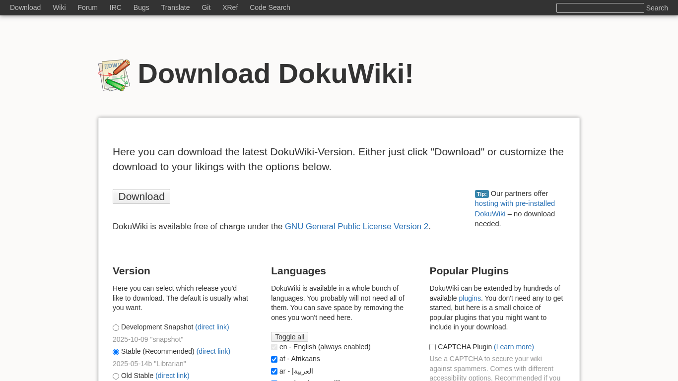 AI-анализ | This online resource is a website dedicated to providing users with the latest versions of DokuWiki, a free and open-source wiki software. Users can download the software directly from the website, with the option to customize their download by selecting specific releases or additional components. DokuWiki is available under the GNU General Public License Version 2. The website offers a summary of changes for each release and an archive for older versions. Additionally, users can download only the changed files since an old stable version or include a minimal webserver with PHP for quickly trying or running DokuWiki. The website is available at download.dokuwiki.org. |