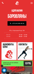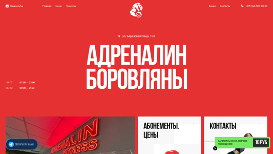 AI-анализ | The web project "Adrenalin Borovlyany" is a fitness club located in Borovlyany, Belarus. The website provides information about the best prices for fitness classes in the modern training hall, which features experienced fitness instructors and advanced equipment. The address is listed as ul. Berezovaya Roscha, 108, with operating hours from Monday to Thursday: 7:00 AM - 11:00 PM and 9:00 AM - 9:00 PM, and on Fridays and Saturdays: 7:00 AM - 11:00 PM. The club offers various discounts and promotions, including a first visit discount with a 50% reduction and a super unlimited offer. The website also features personal trainers, each with their specific areas of expertise, such as sports, rehabilitation, fitness, |