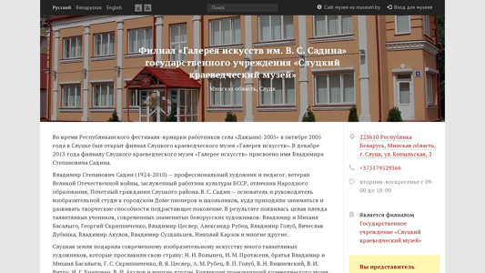 | SEO-описание | Филиал «Галерея искусств им. В. С. Садина» государственного учреждения «Слуцкий краеведческий музей» — новости и афиша мероприятий, информация для посетителей, цены, экспозиция, коллекции, материалы для музейщиков. |