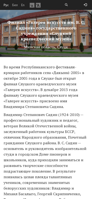 | Название / Заголовок | Филиал «Галерея искусств им. В. С. Садина» государственного учреждения «Слуцкий краеведческий музей» |