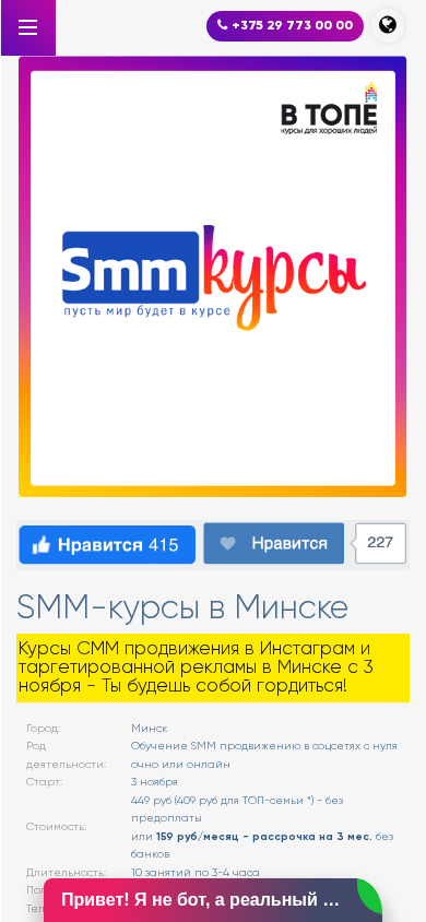 | AI-анализ | The portal SMM-kursy.by offers SMM courses in Minsk, Belarus. The title and description of the website emphasize on-site SMM training for beginners in social media promotion and targeted advertising. The website mentions the start date of the courses as November 3rd, with a cost of 449 rubles (409 rubles for top-family members) for the entire program, which lasts 10 sessions of 3-4 hours each. The portal is actively seeking new students and provides contact information, including a phone number and address. The website also offers a discount for top-family members and the option for a monthly payment plan. The website includes information on the location and dates of upcoming groups, as well as a call to action to sign up. The portal also mentions the availability of an Instagram account and encourages visitors to subscribe. The target audience |