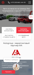 | AI-анализ | The portal Autogroup.by is a Belarusian website offering custom car orders from international auctions and platforms. Users can arrange for cars to be imported from the United States, Europe, China, and South Korea. The website includes sections for vehicle catalogs, motorcycles, and deliveries from the United States, Europe, China, and South Korea. Other features include information, news, company details, an offer agreement, FAQ, a customs calculator, and a Carfax report. Services include payment, deposit, trade-in, and vehicle monitoring. The contact information provided is a single number for Belarus: +375 (29) 660-44-55. The site claims to offer car purchases from abroad without intermediaries or hidden payments. Autogroup.by is the marketing partner of the IAA auction in Belarus, providing absolute confidence and trans |