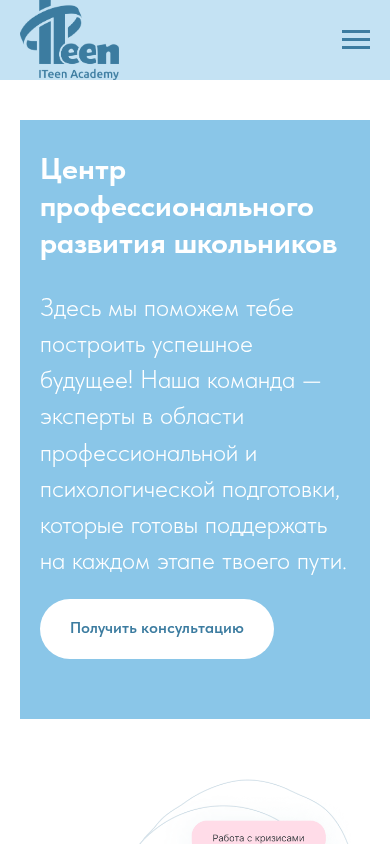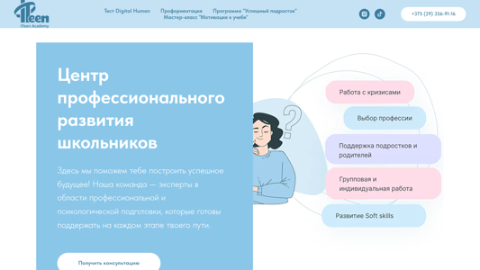 | AI-анализ | --- The web project iteen-prof.by is a professional development center for schoolchildren in Minsk, offering consultation services with experienced career counselors. The center also provides programs and master-classes for teenagers and parents. Keywords: career development, schoolchildren, Minsk, career counseling, programs, master-classes. The website offers consultation services for schoolchildren to help them determine their career paths, develop emotional intelligence, and build confidence. It also provides support for students in their professional self-definition, developing soft skills, overcoming career-related fears and stresses. Parents can also benefit from the center, gaining psychological tools to support their children in their career choices and better understand their needs. Services include testing for teenagers in 8-11 grades using the Digital Human platform, career orientation for schoolchildren in 9-11 grades, and a successful teenager program. The center aims to help all |