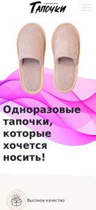 | AI-анализ | This website is an online catalog for disposable slippers, called 'Tapochki,' located in Minsk, Belarus, at ul.Tatarskaya, 3. The catalog offers a variety of slippers, including those with a closed and open heel, for both business and comfort use. Customers can buy slippers in bulk or individually, and various payment methods are accepted. The slippers are available in different colors, materials, and prices, ranging from budget to premium options. The website also provides information on the company's location, contact details, and working hours. Users can subscribe to the email list for updates on new arrivals, sales, and promotions. |