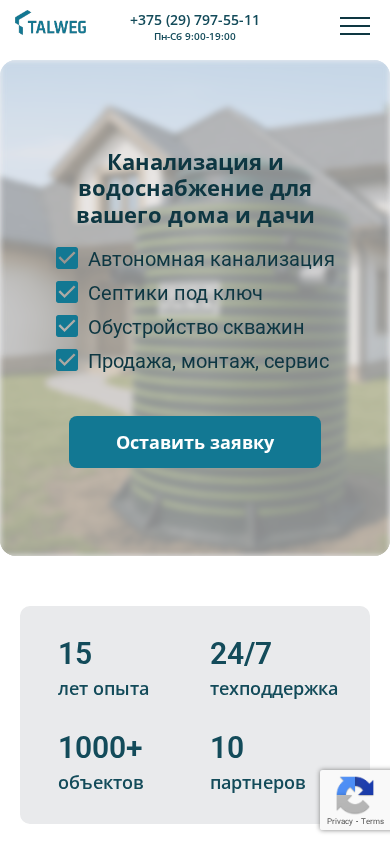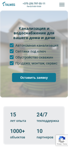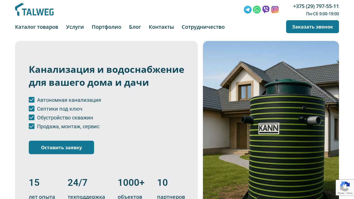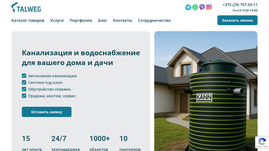| AI-анализ | --- The website is a company specializing in the installation of autonomous sewage systems in Belarus and the Brest region. They offer services using Septics, Cesspools, Drain Stations, and Biological Wastewater Treatment Stations. The company operates throughout Belarus and the Brest region. It features a catalog of products and services, a portfolio, a blog, contacts, and partnership information. The site provides information on the advantages of installing autonomous sewage systems, including reliability, long-term operation, city comfort, savings, eco-friendliness, ease of installation, and independence. Talweg is the first official dealer in Brest region for KANN, a leading producer of wastewater treatment facilities. The site offers popular products such as a compressor tank, biological wastewater treatment stations, Cesspools, and septic tanks. |