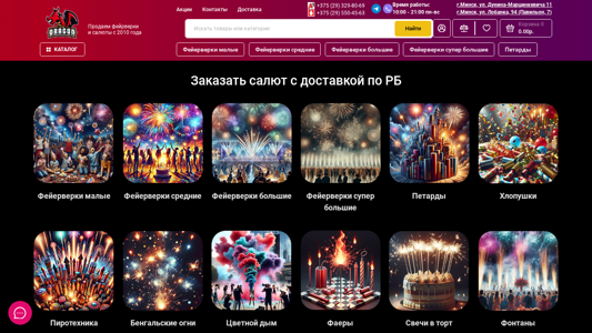| Адрес | Пиротехника оптом, Сотрудничество, Система скидок, Доставка, Организация и проведение салюта, СХЕМА ПРОЕЗДА, НАШ РЕЙТИНГ, Поддержка, +375 |