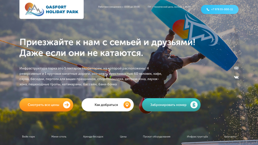 | AI-анализ | This website is for Gasfort Holiday Wake Park, an active recreation facility on a lake in Crimea. The park operates daily from 10:00 to 20:00, except for technical days. It features a circular cableway with 17 figures and areas for freestyle tricks, as well as four reversing cableways. The infrastructure includes a 5-hectare area with a hotel accommodating 60 people, a café, sauna, gazebos, a lawn zone, a sports field, a children's zone, a lounge zone, pedestrian trails, catamarans, a swimming pool, a sauna-barrel, and rental equipment for wakeboarding. Visitors can also rent cottages and book accommodation. The park offers prices for various activities, including wakeboarding on the circular cableway starting from 1400 rubles for |