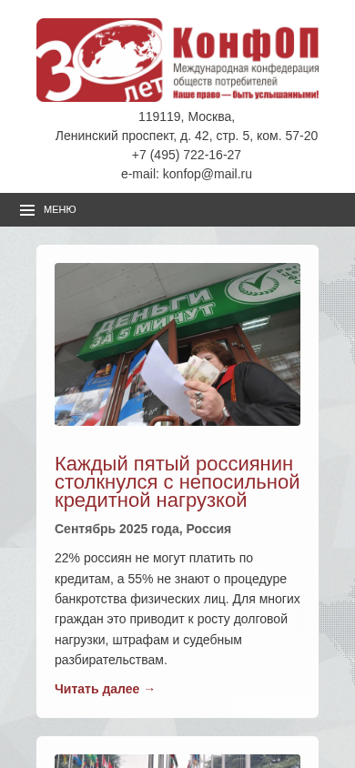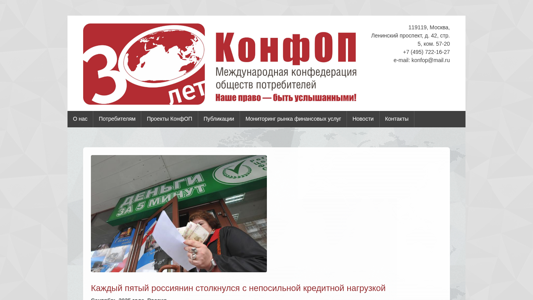 | AI-анализ | This website is the official site of the International Consumer Confederation (КонфОП) in Russian. It provides information about the organization, its structure, members, and various projects related to consumer rights, including financial services, housing, and utilities. The website also offers educational resources, such as a school for consumers and a judicial practice section. Topics covered on the site include consumer protection legislation, credit issues, and case studies. The site includes sections on consumer rights in relation to banking, housing, utilities, medicine, and tourism. The website also features news and publications related to consumer protection. From September 2025, 22% of Russians reportedly cannot pay their debts, and 55% were unaware of the bankruptcy process for individuals. The site aims to address these issues by developing the potential of non-commercial organizations to help citizens facing financial difficulties. The site includes |