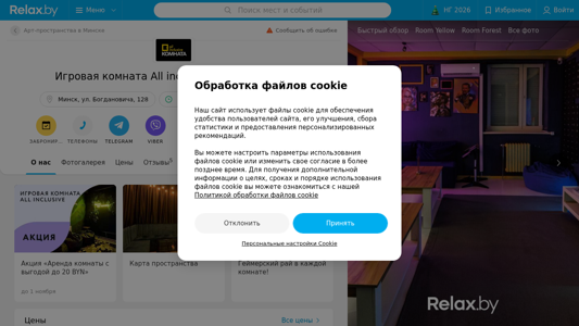| AI-анализ | The website Komnata All Inclusive (Ол Инклюзив) is an art-space in the Soviet District of Minsk, Belarus, offering private rooms for cozy gatherings, celebrations, and enjoyable leisure time. Guests can bring their own food and drinks, play music, and even sing or play in the karaoke room. The space combines a homely atmosphere with a stylish interior, featuring decorative accents worth photographing. A mini-kitchen, relaxation area, and entertainment zone are also available, along with three rooms, each with its unique ambiance. The Yellow Room is spacious and bright, perfect for friendly gatherings, with soft sofas, chairs, a large screen, neon details, and a warm atmosphere. Amenities include PlayStation, VR, karaoke, table games, and RockBand for dancing, games, and an enjoyable |