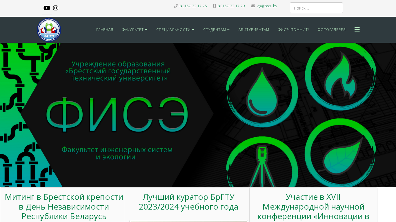 | AI-анализ | --- The web project <www.fise.bstu.by> is the homepage of the Faculty of Infrastructure, Transport and Water Engineering at Brest State Technical University (BSTU). The site provides information about the faculty's history, departments, academic programs, and notable alumni. Keywords associated with the site include "faculty", "systems", "students", "engineering", and "ecology". The site features a menu with links to various departments, contact information, and a calendar of events with upcoming meetings and conferences. The faculty offers undergraduate and graduate programs in various engineering disciplines, including water supply and wastewater treatment, thermal power and ventilation, and engineering ecology and chemistry. The site also includes information about housing for students, tuition payment, and print services. Notable events mentioned on the site include the annual Independence Day celebration at Brest Fortress and |